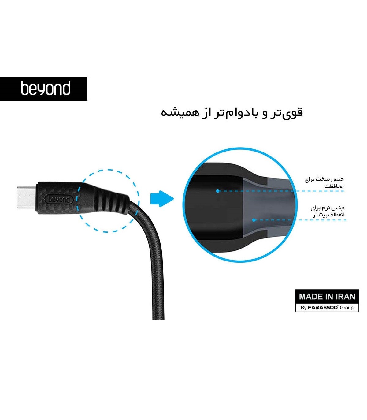 کابل شارژ میکرو بیاند مدل 305 برای شارژ و انتقال دیتا از دستگاه هایی که خروجی میکرو یا تایپ سی دارند استفاده میشود.این کابل دارای روکش بافت یا با اصطلاح کنفی میباشد و همین باعث میشود دوام کابل بسیار بیشتر از کالاهای مشابه باشد.همچنین روکش کنفی کابل از گره خوردن و پیچ خوردن کابل نیز جلوگیری میکند.
