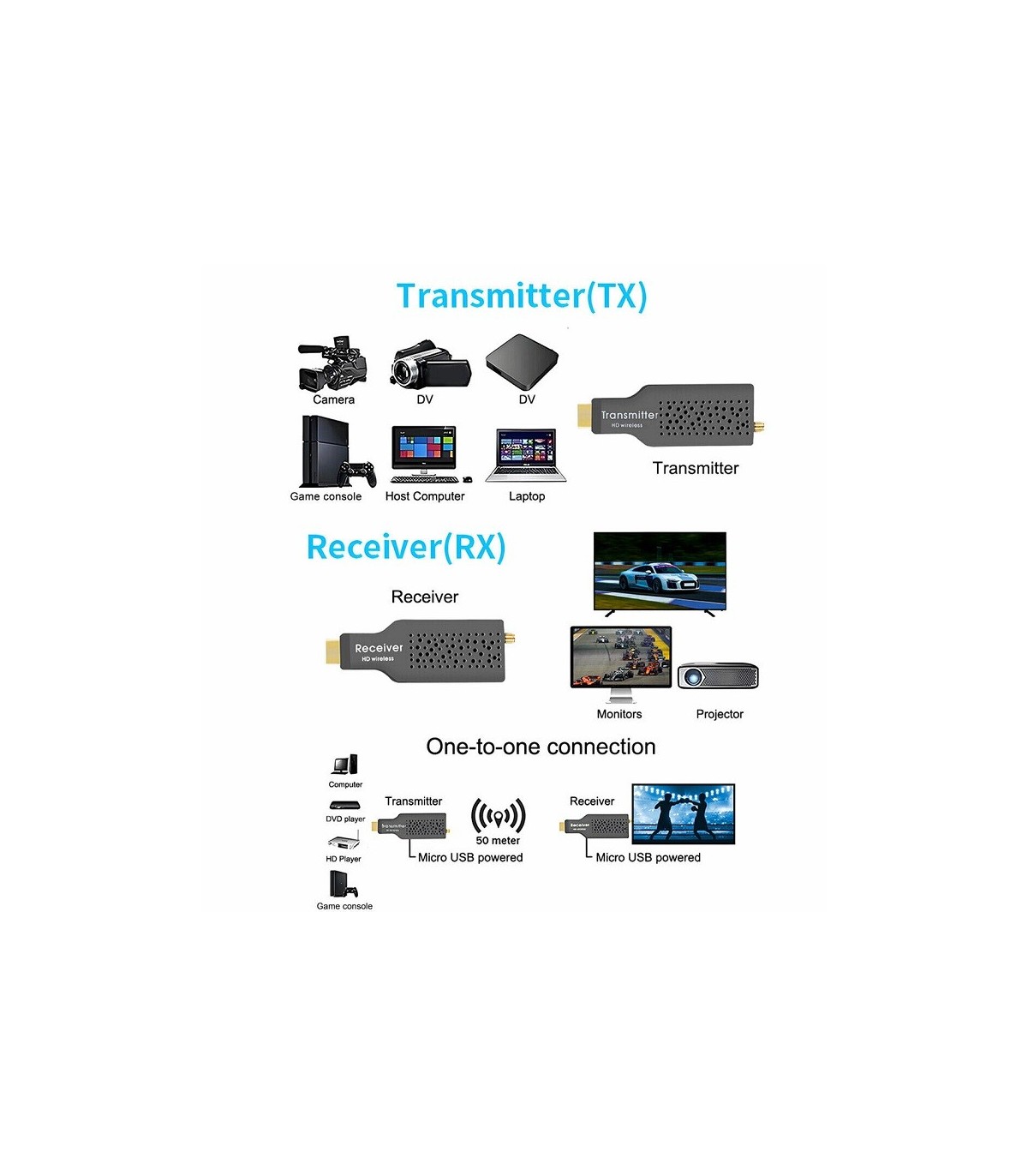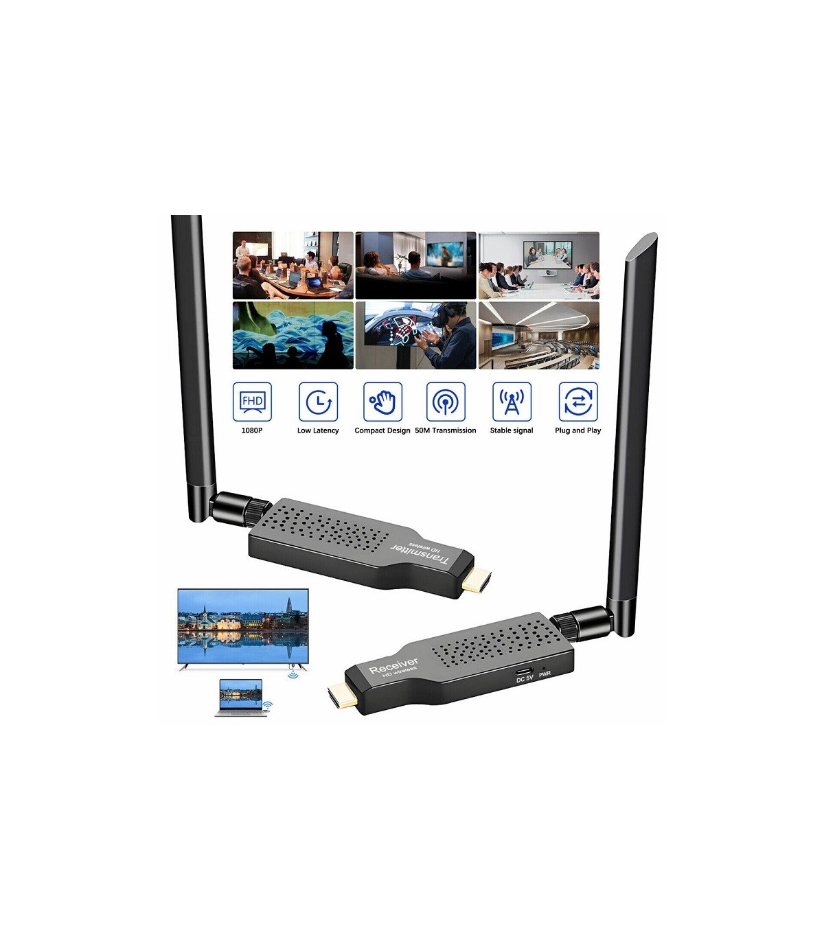 از این دستگاه برای انتقال تصویر تا فاصله 50 متر بدون نیاز به کابل و اینترنت و با استفاده از امواج وای فای استفاده میشود.برای استفاده از این دستگاه باید قسمت ترنسمیتر را به دستگاه فرستنده خود مثل لپ تاپ یا کامپیوتر متصل کنید و قسمت گیرنده را به نمایشگر خود متصل کنید.برای همگام سازی این دو قطعه با هم باید از دکمه ای که بر روی این دو قطعه وجود دارد استفاده کنید.