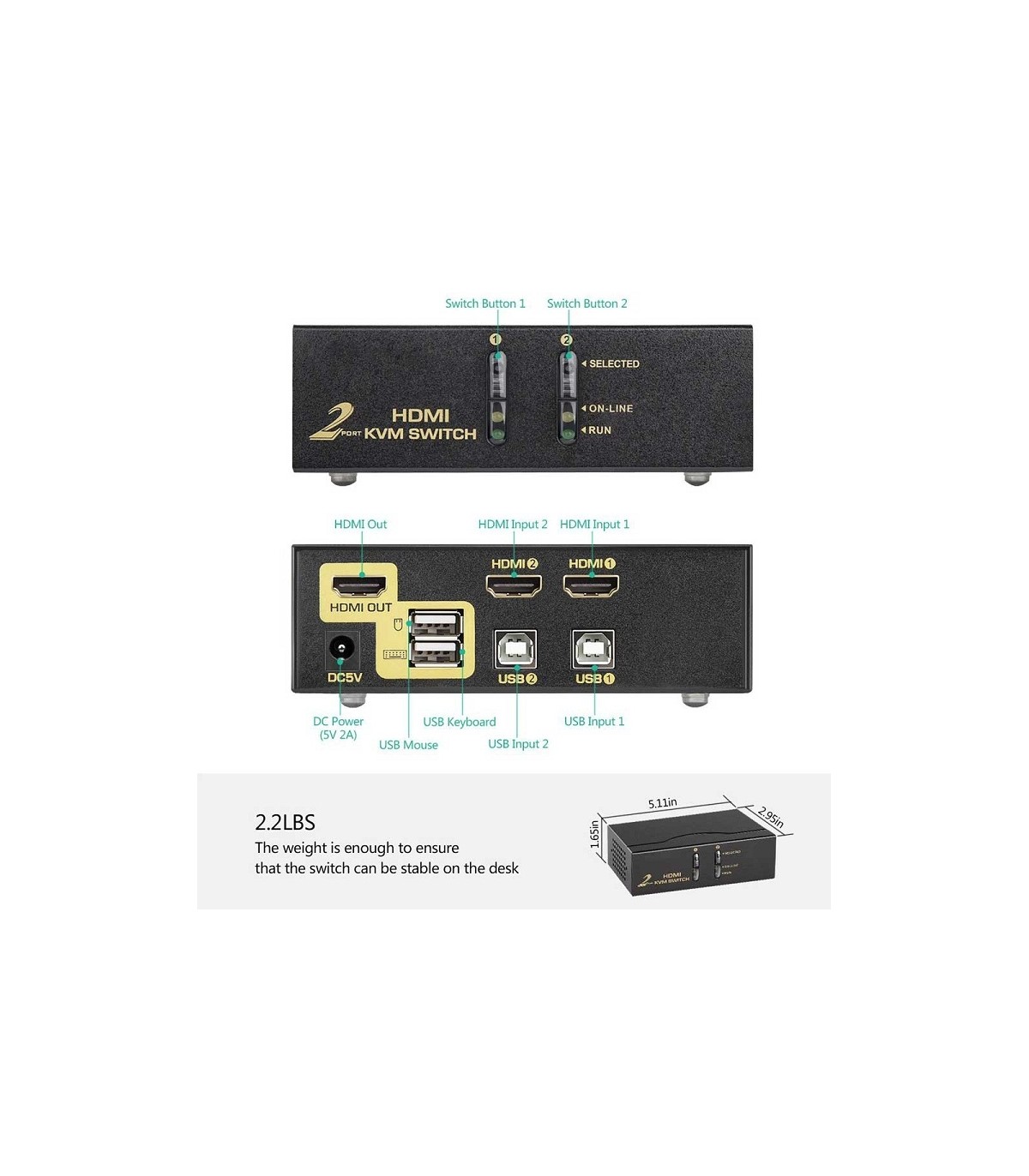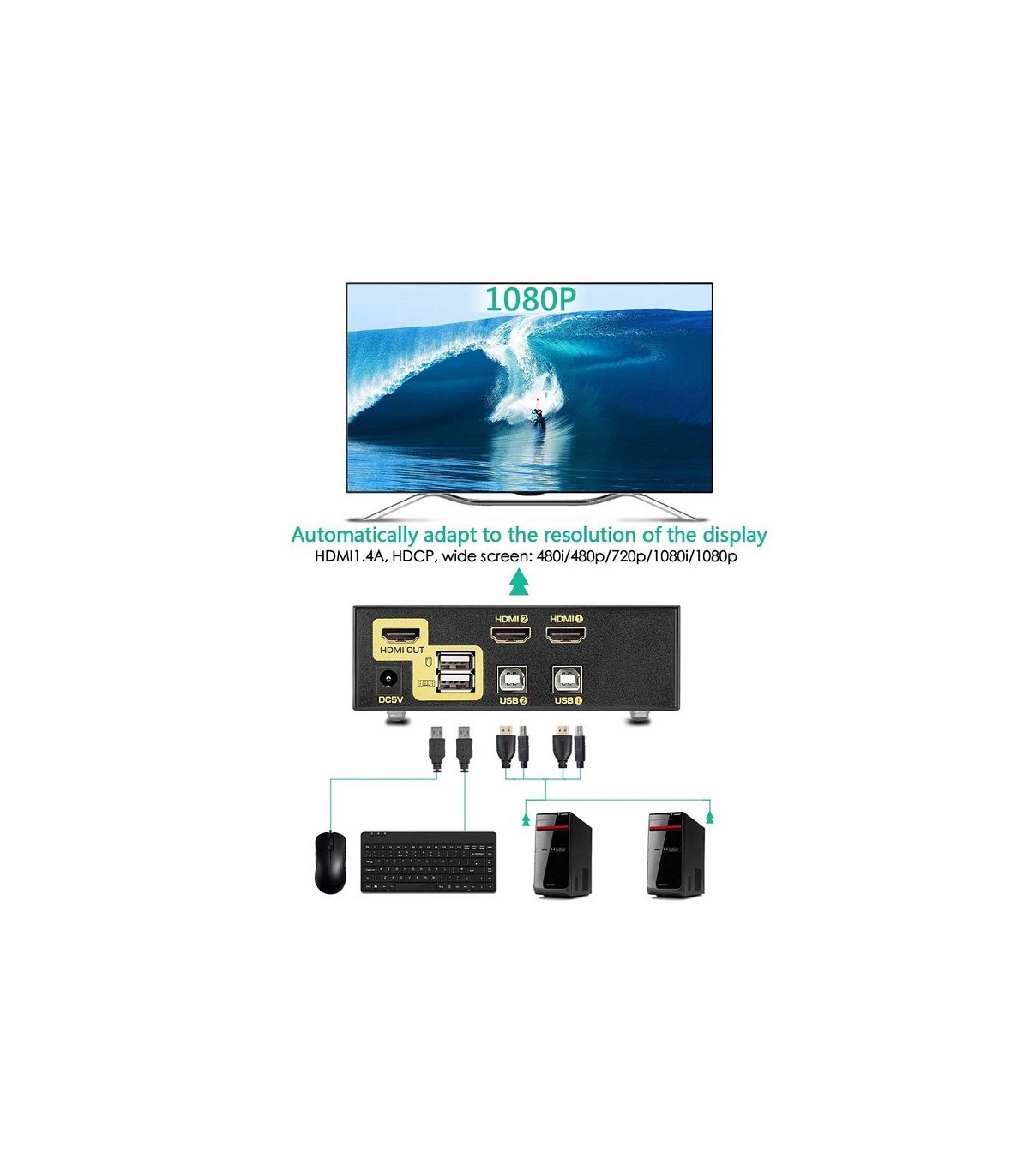 از این سوئیچ برای اتصال دو کامپیوتر به یک کیبورد ، موس و مانیتور استفاده میشود.پورتهای کیبورد و موس USB و خروجی تصویر کامپیوترها از نوع HDMI میباشد.